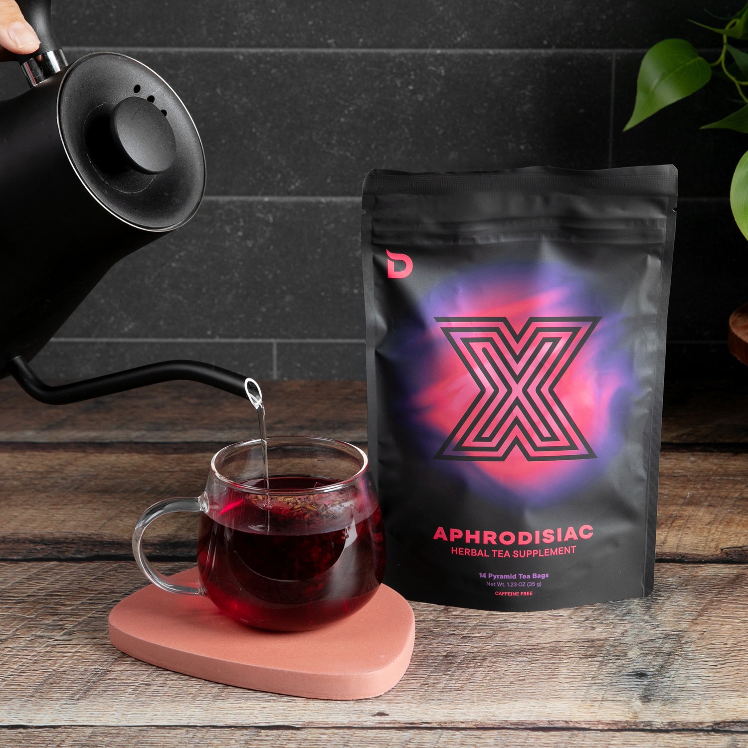 Our Aphrodisiac Tea is a steamy blend of desire-inducing ingredients like the daringly provocative horny goat weed and the sensuous fenugreek. Each sip is a dance of flavors designed to stoke the flames of passion and awaken your senses. A full list of ingredients can be found on the supplements panel on the package.